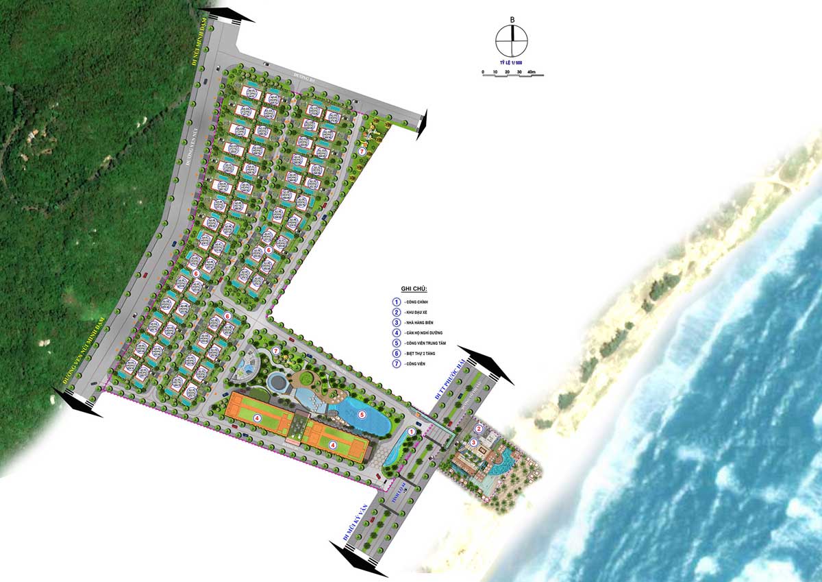 Khu đất biệt thự ven biển có diện tích gần 32.000 m² bao gồm 58 biệt thự The Apus có diện tích hơn 22.000 m², phần đất còn lại dành cho bãi đậu xe, giao thông và các tiện ích khác. Mỗi căn biệt thự The Apus có khuôn viên 350 – 500 m² trong đó diện tích xây dựng chỉ khoảng 105 – 137 m² gồm 1 hầm, 1 trệt và 2 lầu.