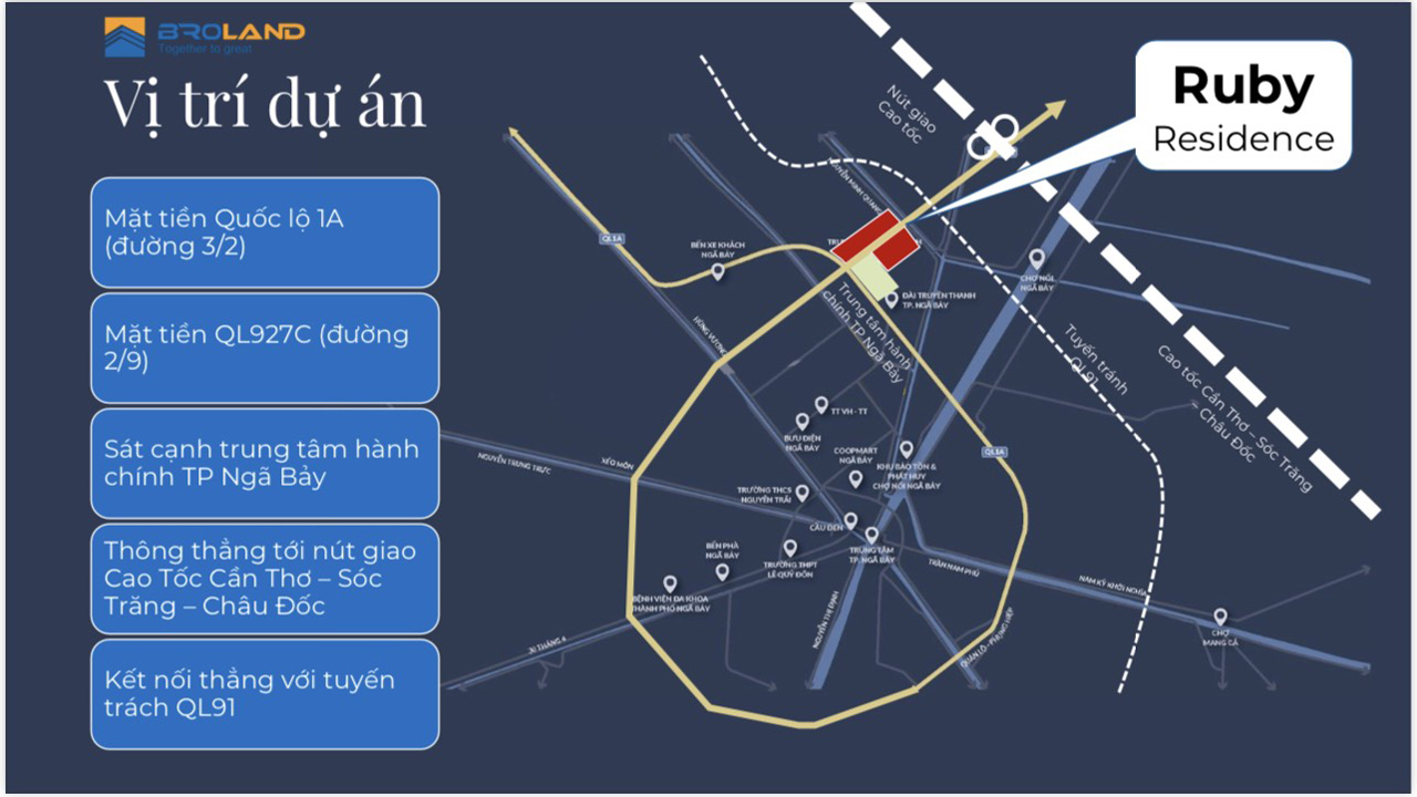 Dự án The Ruby Residence tọa lạc ngay mặt tiền giao lộ Đường 3/2 và Đường 2/9, thuộc phường Ngã Bảy, thành phố Ngã Bảy, tỉnh Hậu Giang.