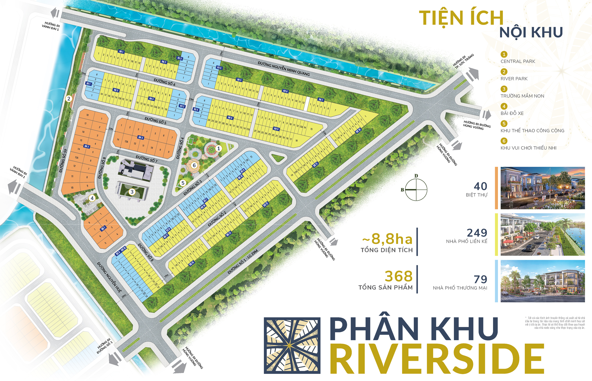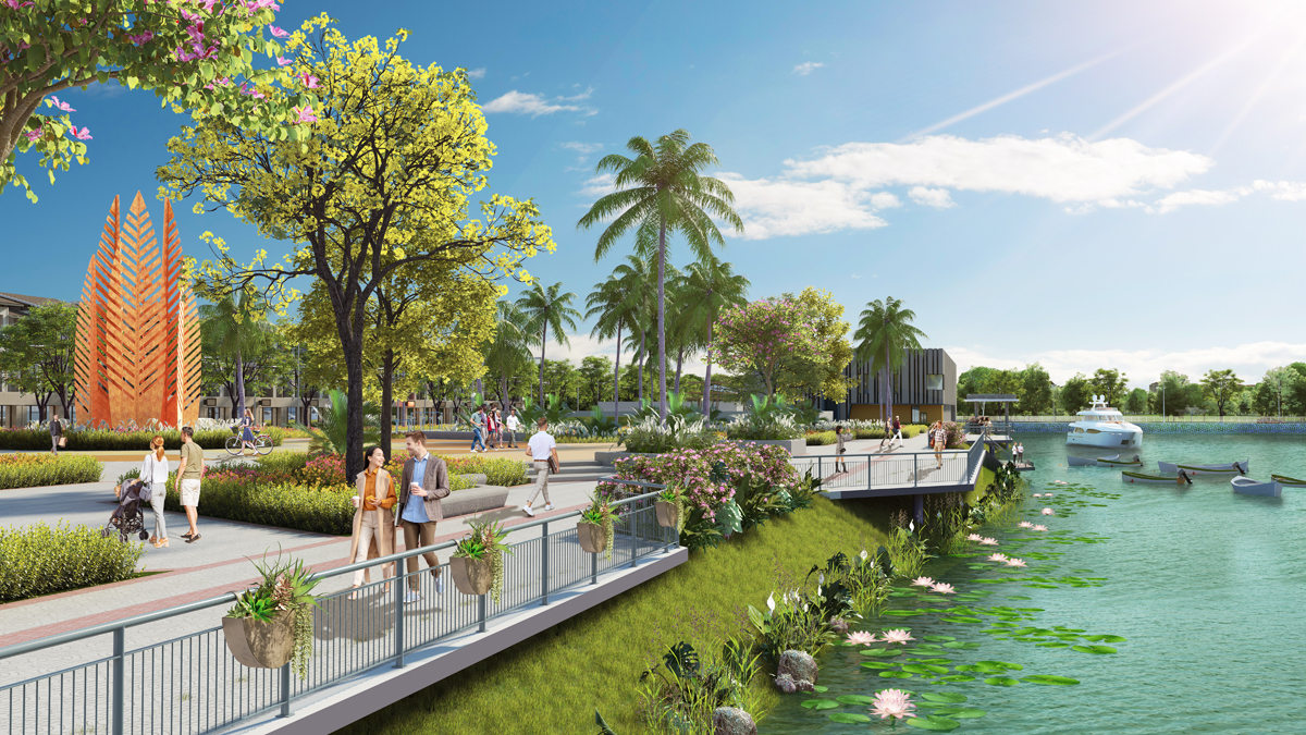 Phân khu Riverside một mặt giáp sông Mái Dầm, một mặt giáp kênh đào điều tiết, thủy khí vượng trạch tạo thế trường thịnh thường niên. Phân khu Riverside chính là viên ngọc được giao hòa bởi những yếu tố phong thủy kiến tạo nên một môi trường sống phát triển, hiện đại.