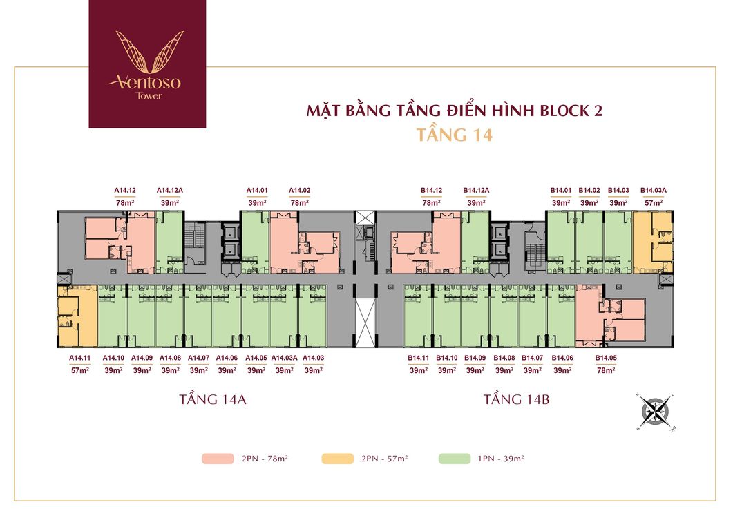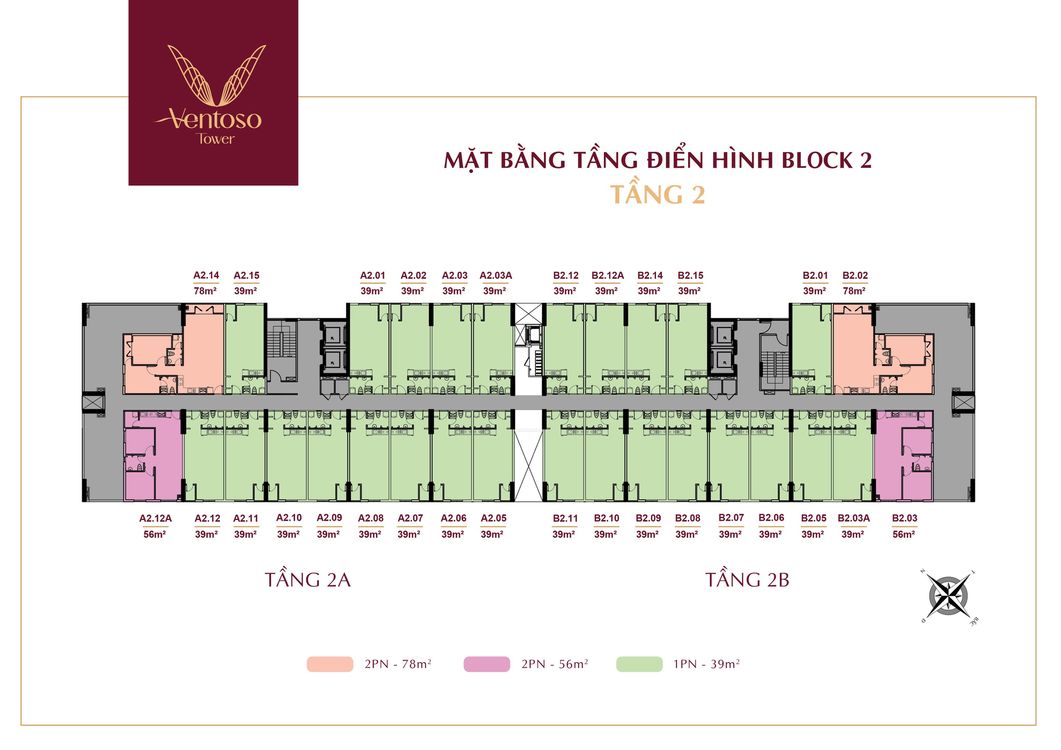 Các căn hộ Ventoso Tower có 3 loại diện tích 39m², 56m² và 78m² trong đó 39m² là các căn 1PN còn 56m² và 78m² là các căn hộ 2PN. Các tầng căn hộ từ 3 đến 12a và từ 15 đến 17 là các tầng có mật độ căn hộ nhiều nhất, 19 căn bao gồm cả 2 block A và B.
