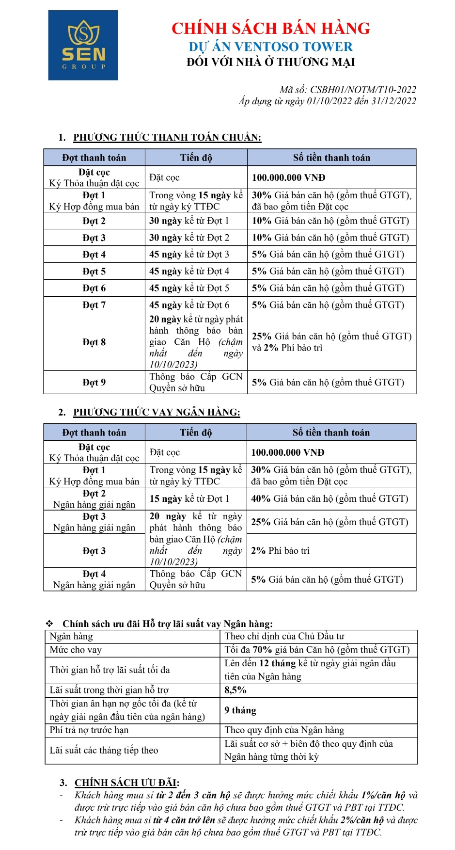 - Khách hàng mua sỉ từ 2 đến 3 căn hộ sẽ được hưởng chiết khấu 1%/căn hộ và được trừ trực tiếp vào giá bán căn hộ chưa bao gồm thuế GTGT và phí bảo trì tại TTĐC.