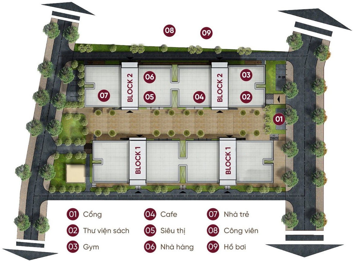 ≡ Shop thương mại ≡ Phòng tập thể hình ≡ Nhà trẻ ≡ Hồ bơi ≡ Nhà sách ≡ Công viên