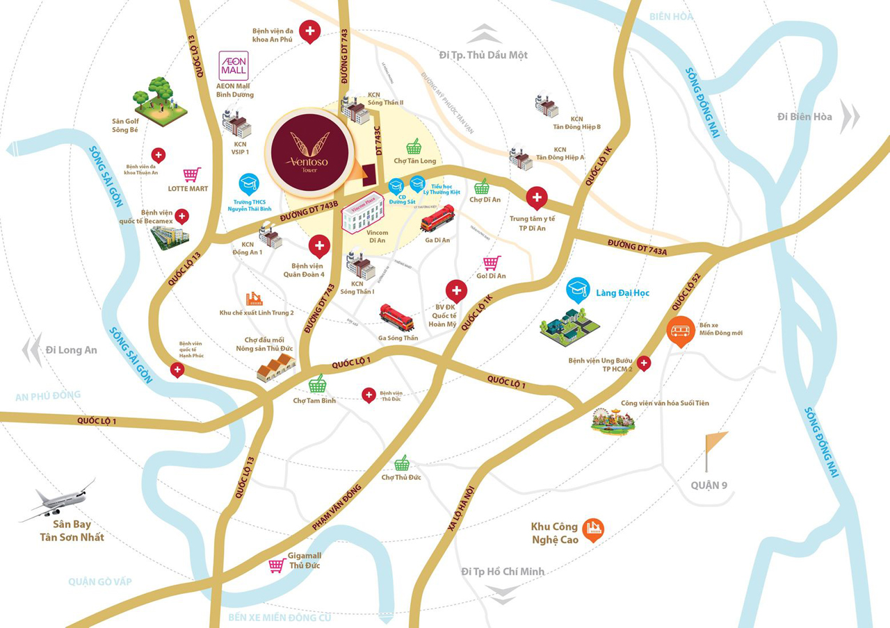 Dự án Ventoso Tower tọa lạc ngay mặt tiền DT 743C, thuộc xã Tân Đông Hiệp, thành phố Dĩ An, tỉnh Bình Dương. Ventoso Tower chỉ cách Vincom Dĩ An, Chợ Dĩ An , Chợ Tân Long, Chợ Đông Thành 2km; cách TT y tế Dĩ An, KCN Sóng Thần 1,2;, KCN VSIP, KCN Tân Đông hiệp A, B. Trường học các cấp 1,2,3. UBND và Siêu thị Dĩ An có 5km.