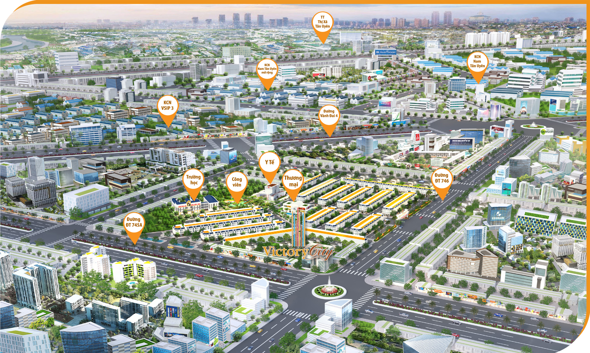 Victory City là tên thương mại của dự án có tên pháp lý là Khu dân cư Tân Lập được UBND Tỉnh Bình Dương cấp Quy hoạch 1/500 vào ngày 10/5/2019. Phía tây bắc của khu đất Victory City giáp với đường ĐT 747, phía đông bắc là mặt tiền chính của dự án giáp đường ĐT 746B, phía đông nam giáp khu công nghiệp VSIP 3 và phía tây nam giáp khu dân cư hiện hữu.